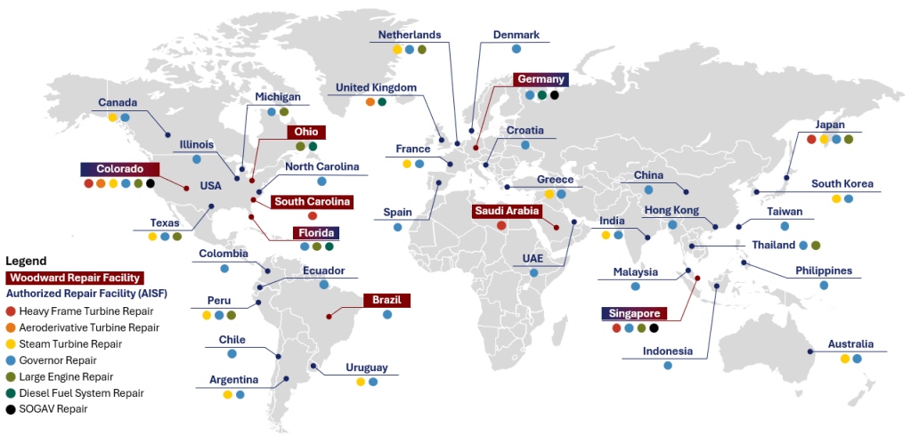 Woodward has manufacturing facilities located all over the globe. No matter where your power plant is based, we have a location near you. Send your valves, actuators and governors into the location closest to you so that your plant has minimal downtime.